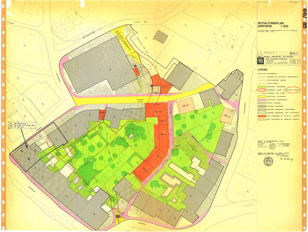 Geplantes Parkhaus unter den historischen Gärten des alten Dorfkerns, siehe gestrichelte, rote Linie. (Einfahrt bei Migros-Rampe, Ausfahrt vis-à-vis Rosengarten. Plan von 1983!) – Dafür sollen nun die Bäume fallen in den historischen Gärten.